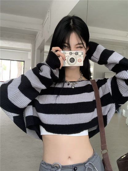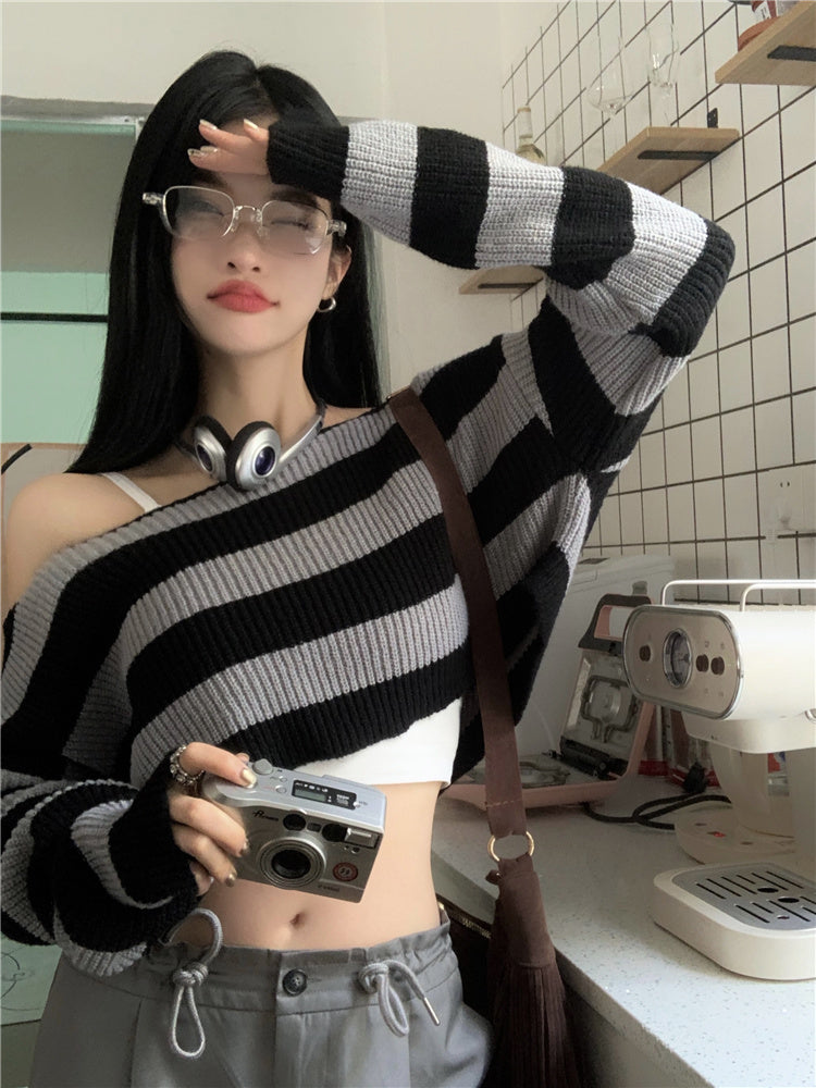 Hier für Sie ein kurzer, schulterfreier Rippstrickpullover.