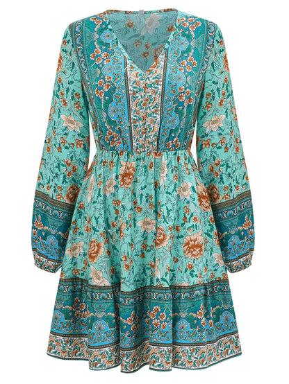 Women's Floral Print V-Neck Long Sleeve Waisted Dress