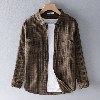 Men's Japanese style slim checkered and striped long-sleeved cotton shirt