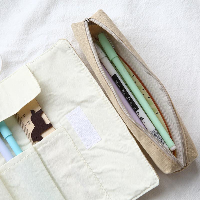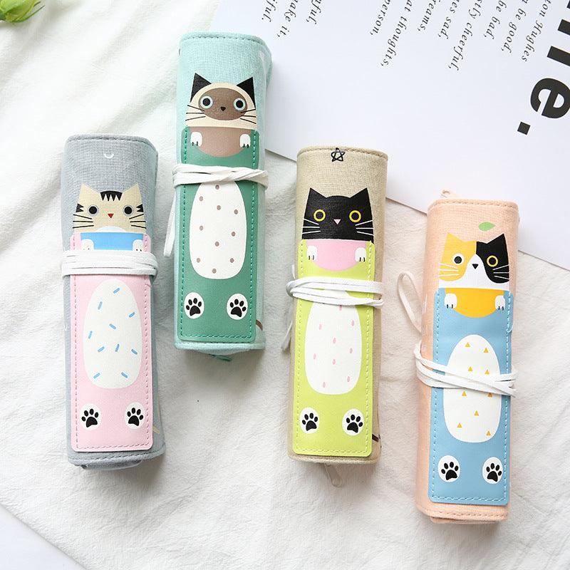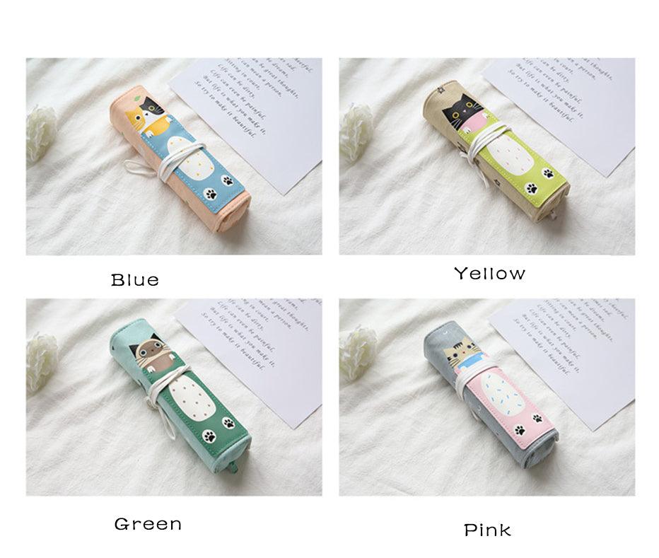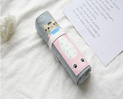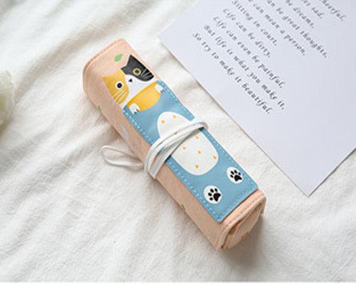 Doppio astuccio, uno arrotolato e l'altro con zip, realizzato in tessuto oxford grezzo e leggero al tatto, resistente e morbido, in stile giapponese con gattino in 4 varianti di colore.