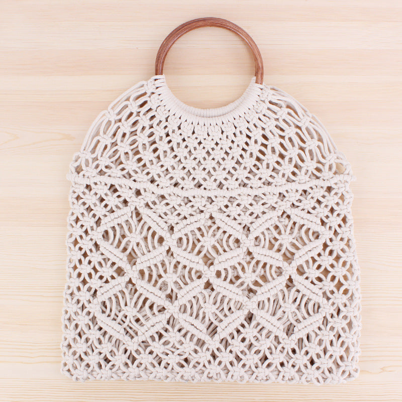 Borsa chic macramè con corda di cotone e anello in legno rattan