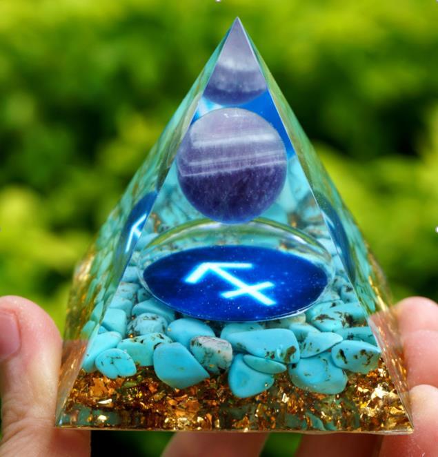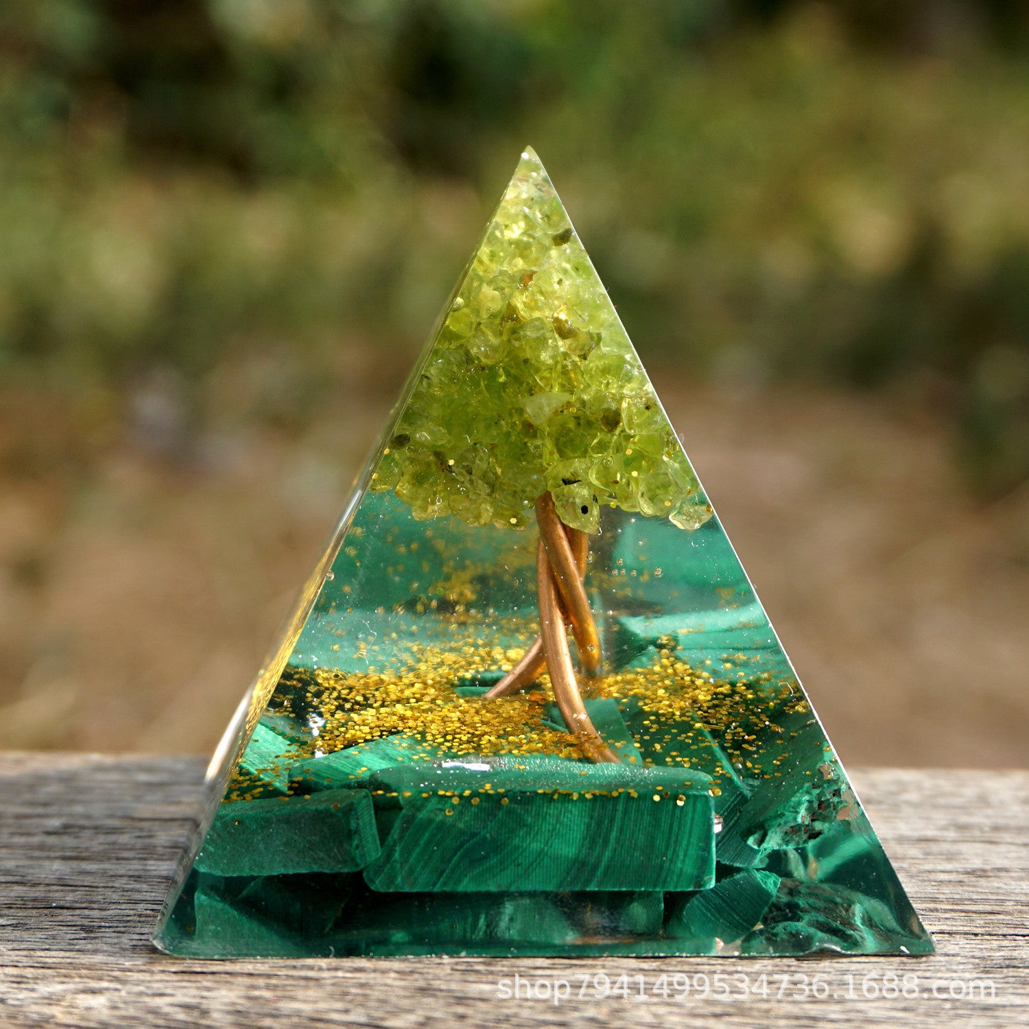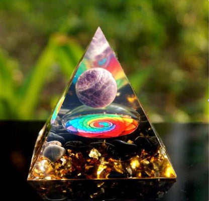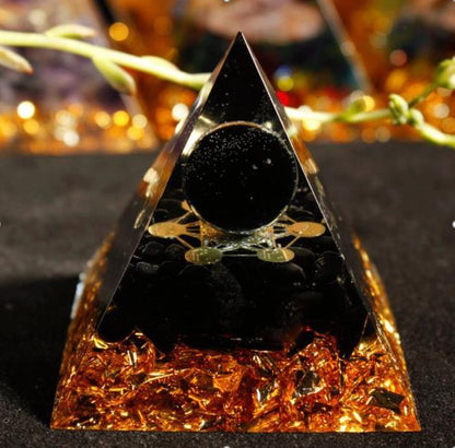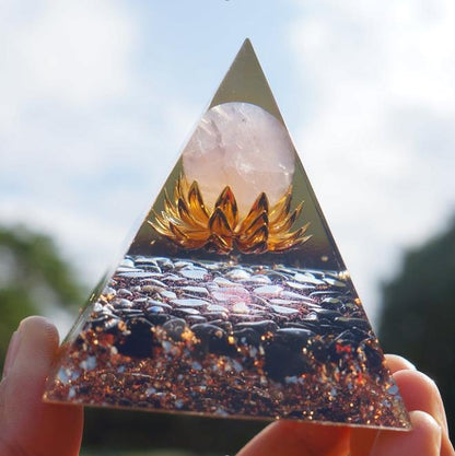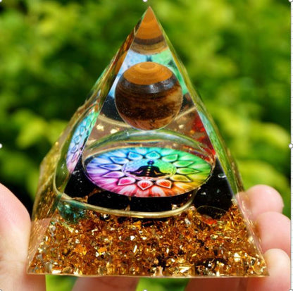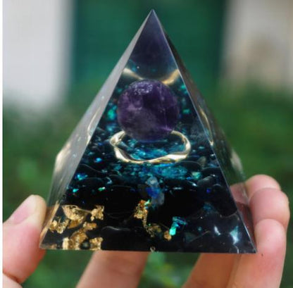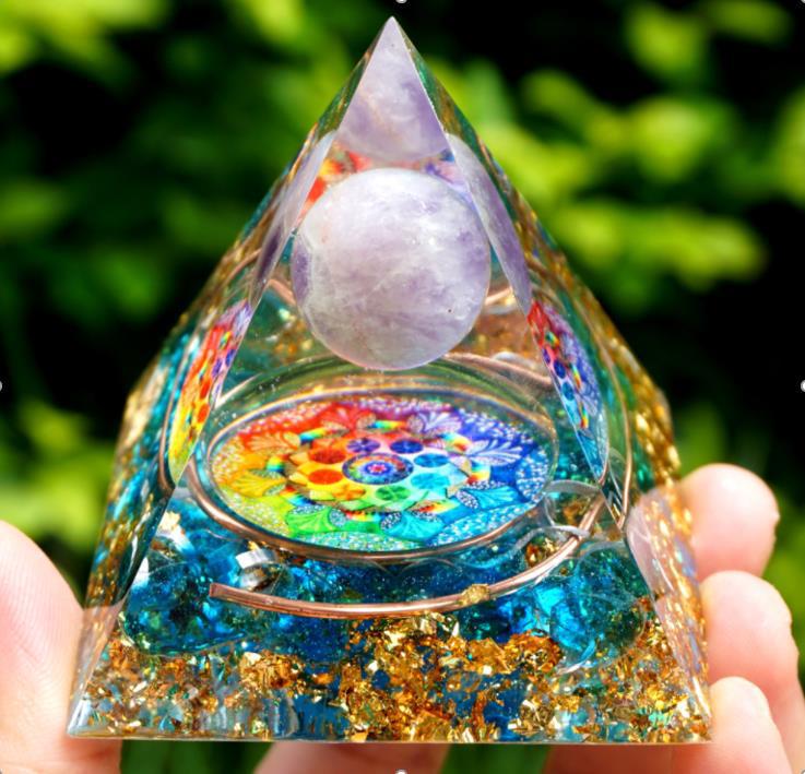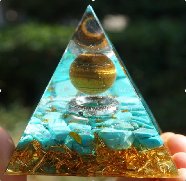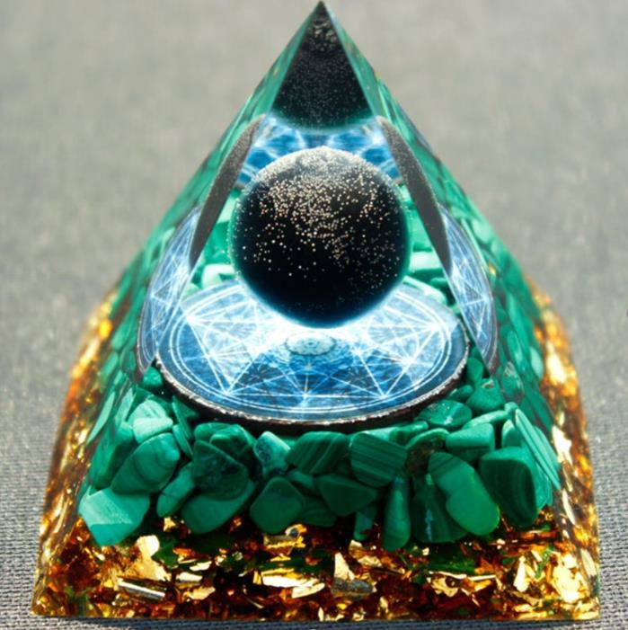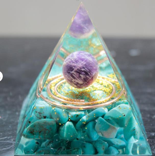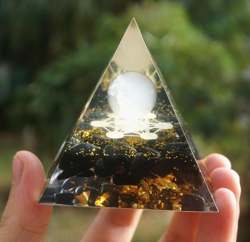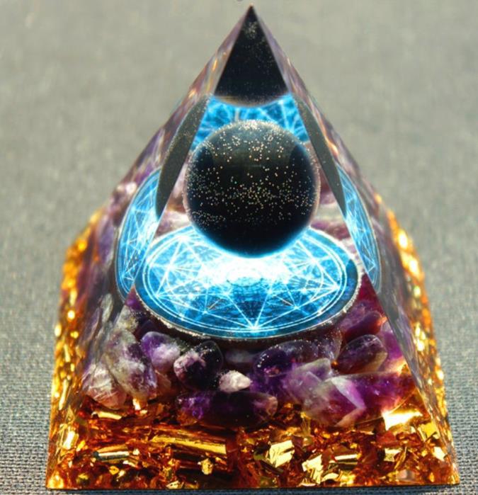 Piramide di cristallo energetico in resina epossidica di cristallo, pietre, lamina d'oro e filo di rame