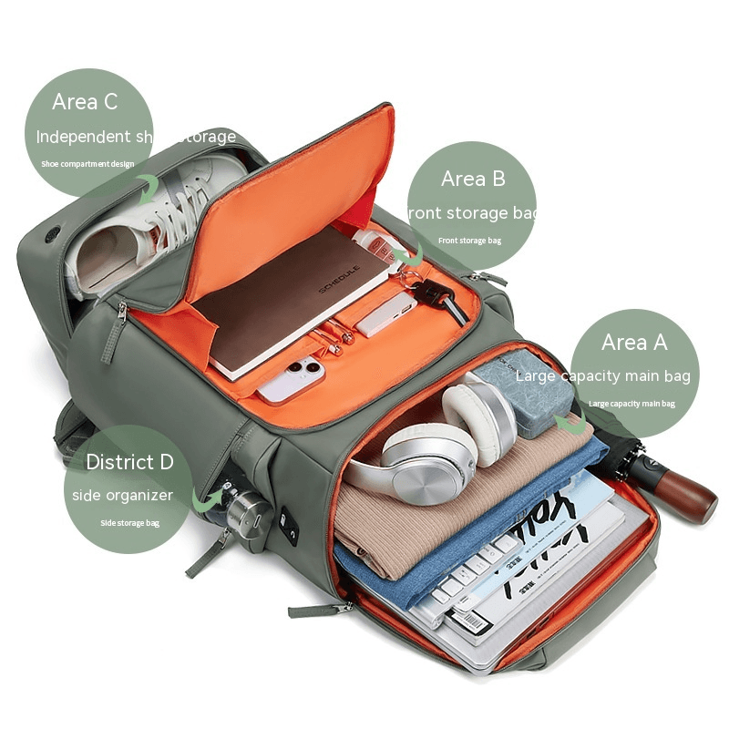 Dal design accattivante, questo zaino multitasche ha una praticità che è senza dubbio il suo punto forte! Al suo interno ogni scomparto può essere dedicato a un oggetto per mantenere tutte le tue cose in ordine e ben visibilmente separate. Una varietà di spazi funzionali e tasche lo rendono perfetto per riporci dentro il laptop, il power bank, il portafoglio ma anche i vestiti e le scarpe! C'è una tasca capiente per i tuoi oggetti umidi quali borraccia o ombrello o beauty da viaggio, ben separata ed isolata per evitare riversamenti indesiderati. C'è anche una tasca segreta per nascondere il tuo cellulare ed il tuo portafoglio nella parte posteriore evitando spiacevoli sorprese!